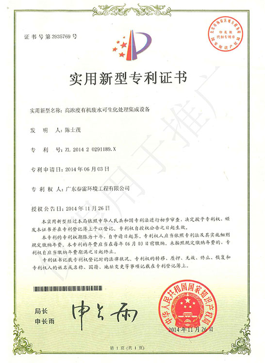 實用新型專利證書-高濃度有機廢水可生化處理集成設備