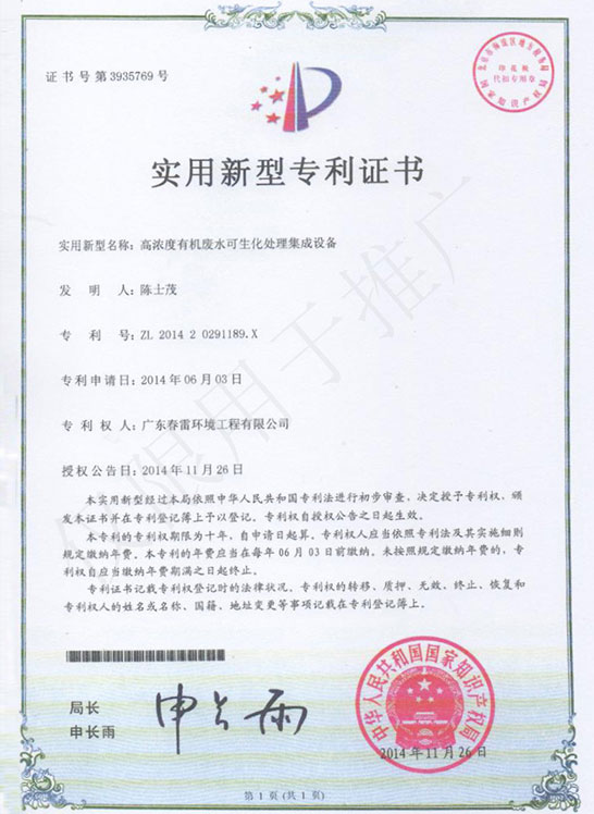 高濃度有機(jī)廢水可生化集成處理裝置實(shí)用新型專利證書